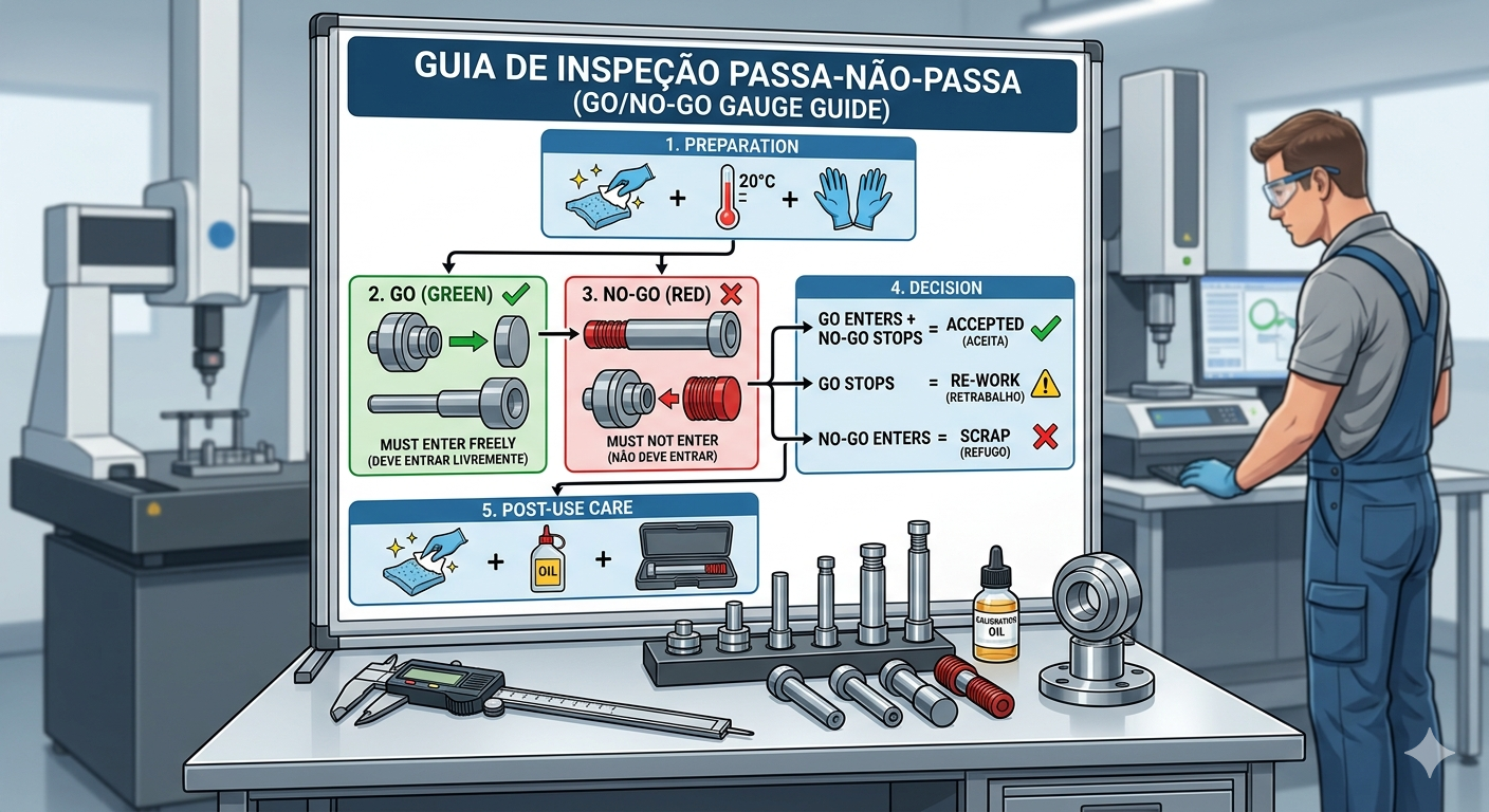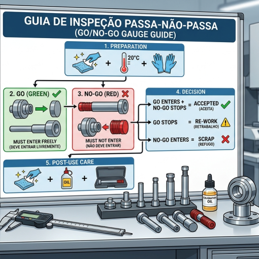 - O Papel do Calibrador: O lado “Passa” do tampão entra com facilidade e o lado “Passa” do anel desliza suavemente sobre o eixo.